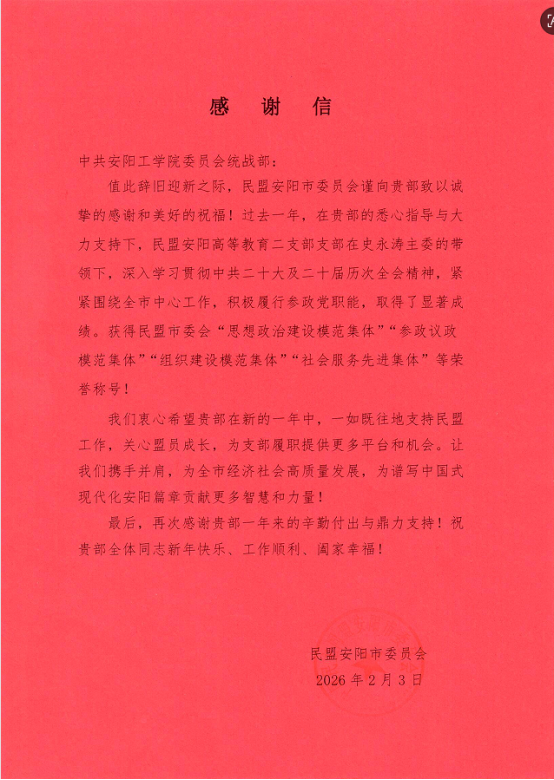 近日,民盟安阳市委员会向我校党委统战部致感谢信,对长期以来在统一战线工作、民主党派建设、盟员履职发展等方面给予的悉心指导与大力支持,表示衷心感谢。